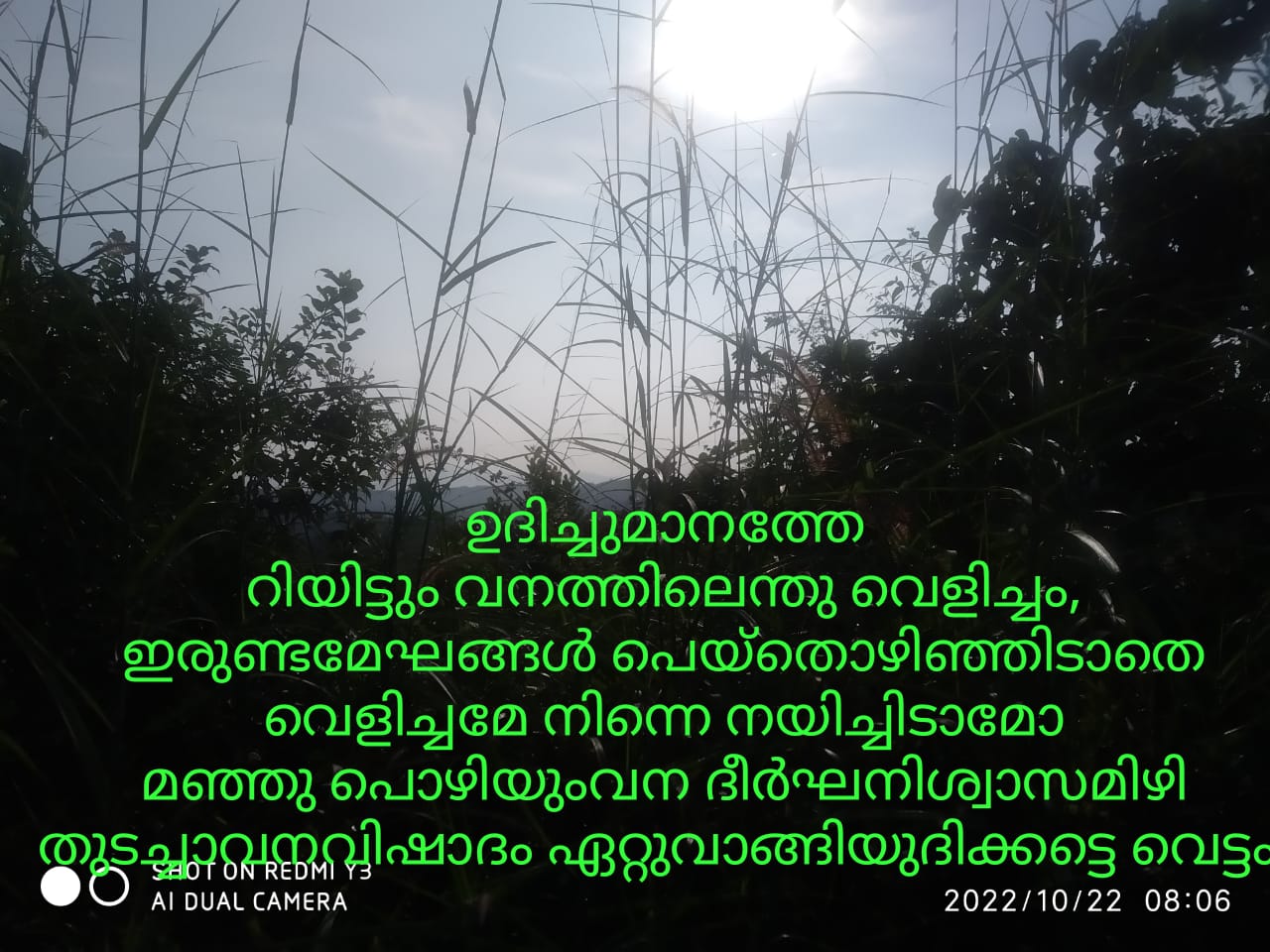 ഉദിച്ചുമാനത്തേ റിയിട്ടും വനത്തിലെന്തു വെളിച്ചം, ഇരുണ്ടമേഘങ്ങൾ പെയ്തൊഴിഞ്ഞിടാതെ- വെളിച്ചമേ നിന്നെ നയിച്ചിടാമോ മഞ്ഞു പൊഴിയുംവന ദീർഘനിശ്വാസമിഴി തുടച്ചാവനവിഷാദം ഏറ്റുവാങ്ങിയുദിക്കട്ടെ വെട്ടം. (സൂര്യൻ മാത്തിൽ )