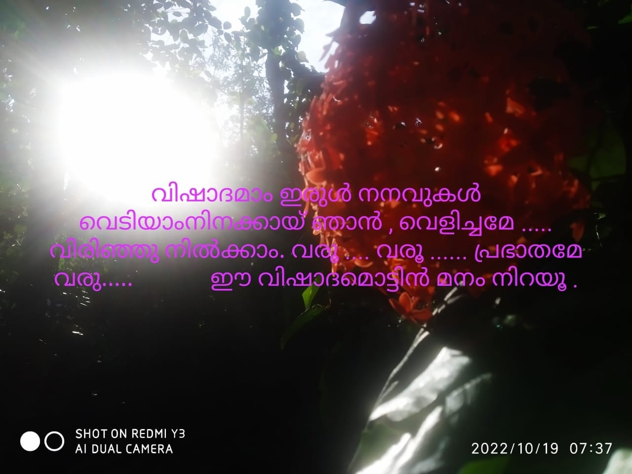 ഇരുൾ നിനവുകൾ വെടിയാം നിനക്കായ് ഞാൻ , വെളിച്ചമേ ..... വിരിഞ്ഞു നിൽക്കാം. വരൂ .... വരൂ ...... പ്രഭാതമേ വരു..... ഈ വിഷാദമൊട്ടിൻ മനം നിറയൂ . (സൂര്യൻ )